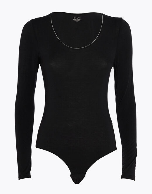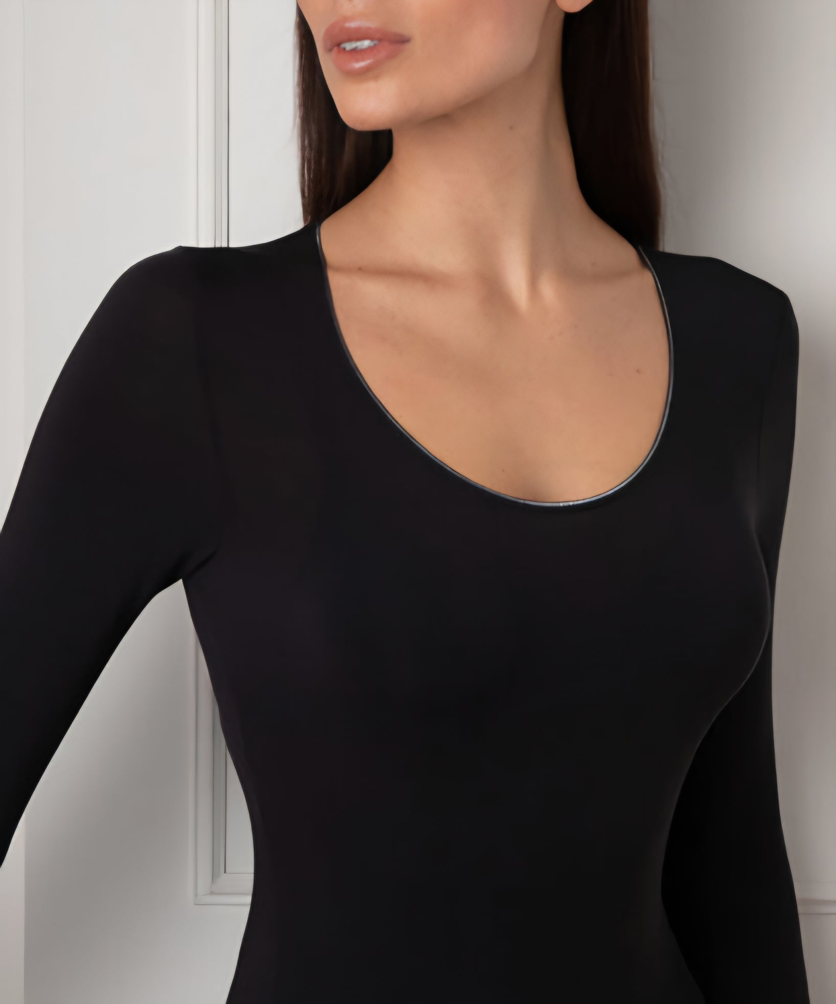 Il Body Manica Lunga con Scollo Tondo Ampio in micromodal è un capo essenziale che coniuga eleganza e comfort in un design minimal.