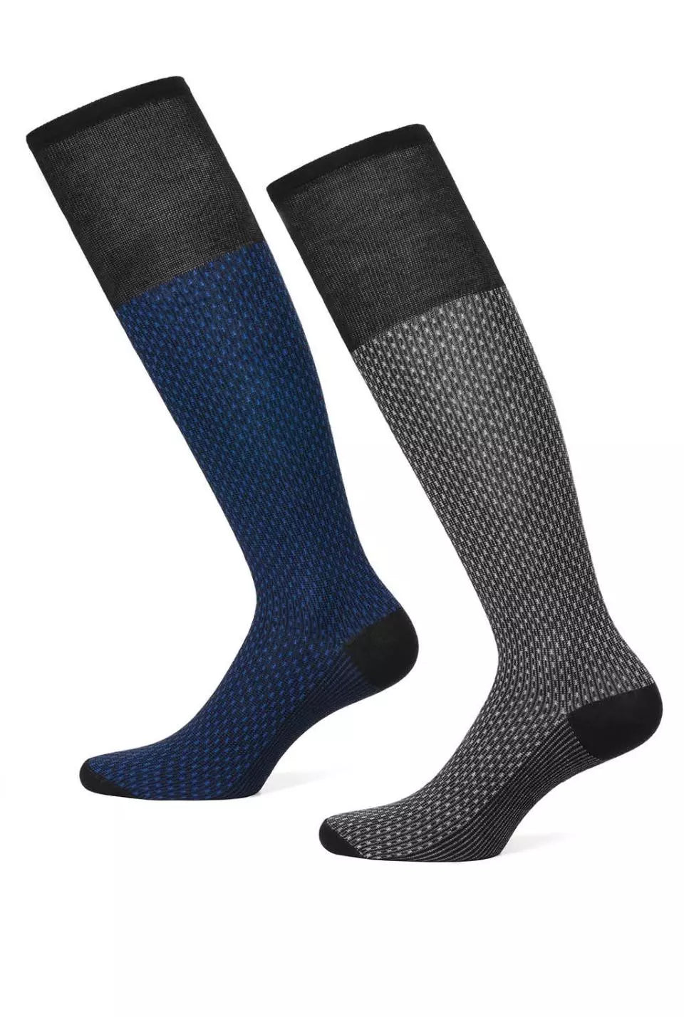 Calze lunghe con cotone e cashmere, motivo geometrico in contrasto realizzato con lavorazione jacquard.
