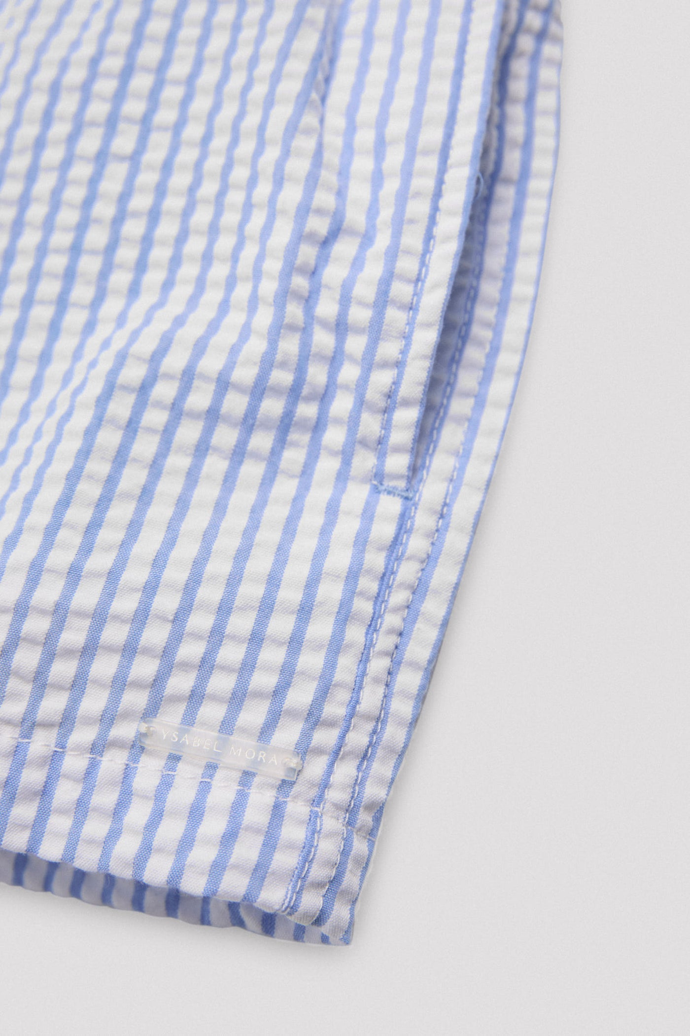 - Tessuto seersucker a righe verticali bianche e azzurre;