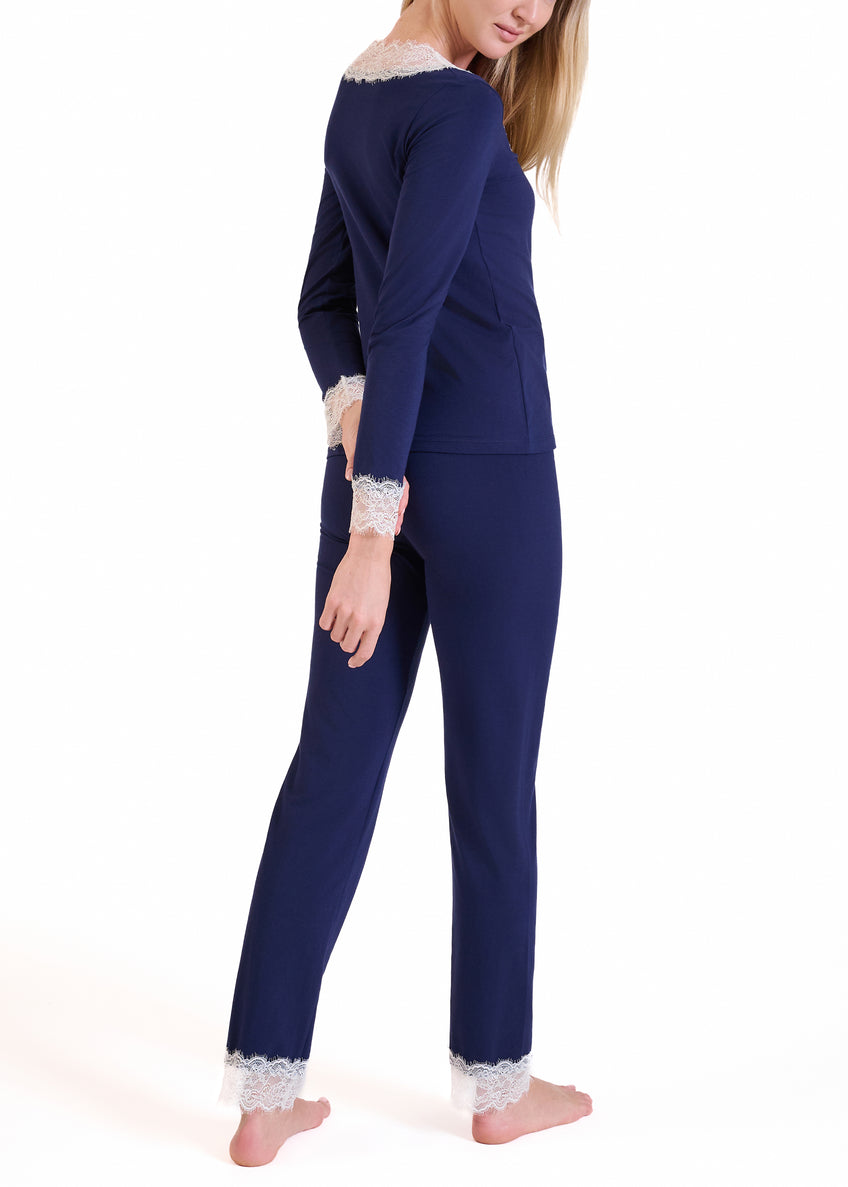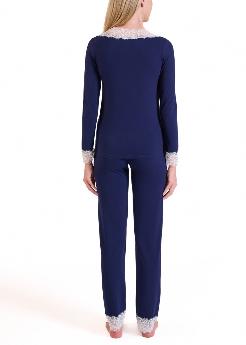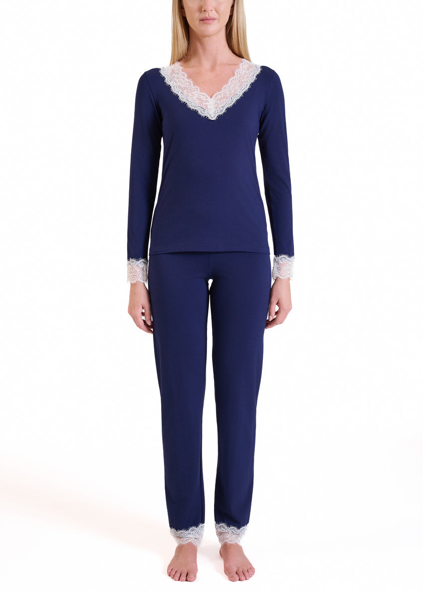 La maglia a manica lunga presenta uno scollo a V profondo, impreziosito da un delicato pizzo a contrasto che si ritrova anche sui polsi e dona un tocco femminile ed elegante. Il pantalone lungo, dalla linea morbida e confortevole, è completato da un elastico in vita e rifinito con pizzo coordinato al fondo gamba, per un dettaglio sofisticato anche nei particolari.