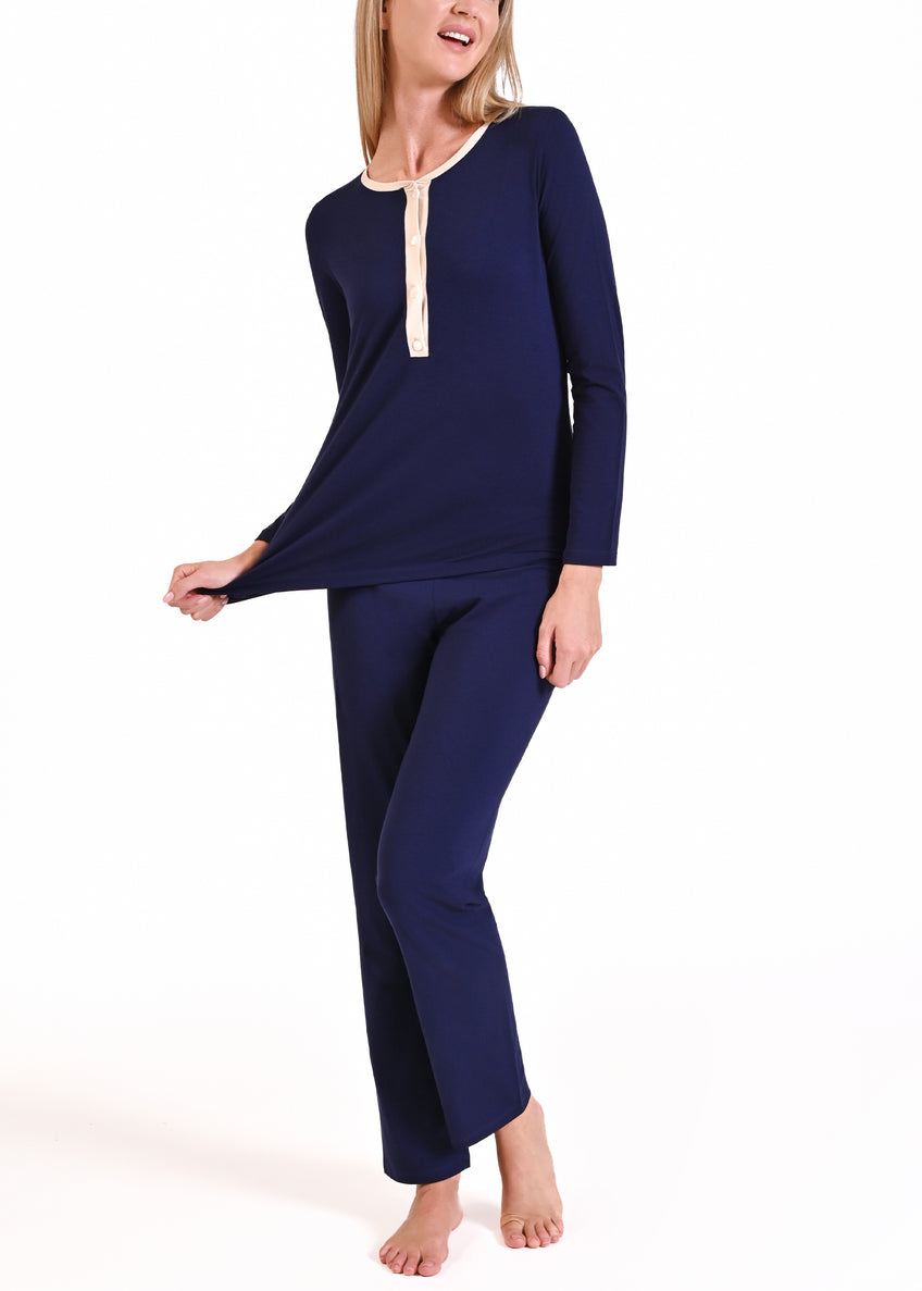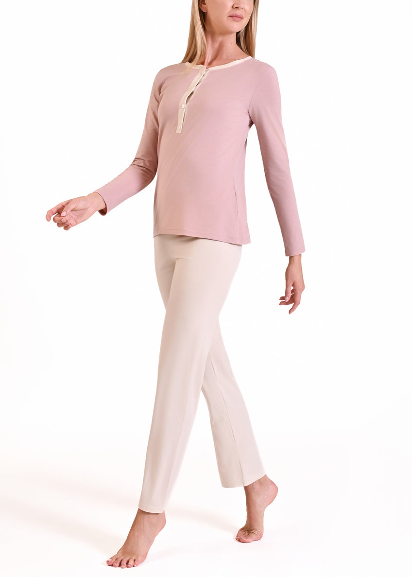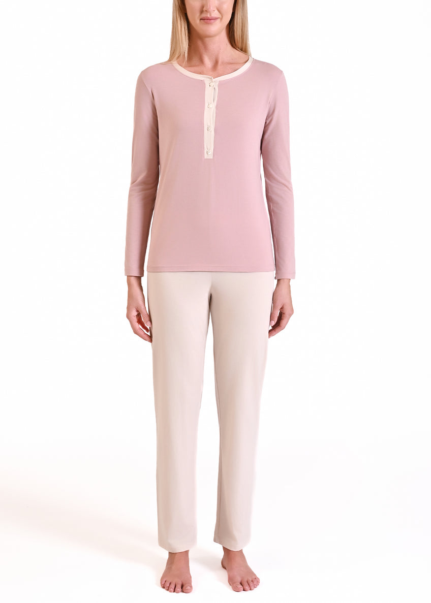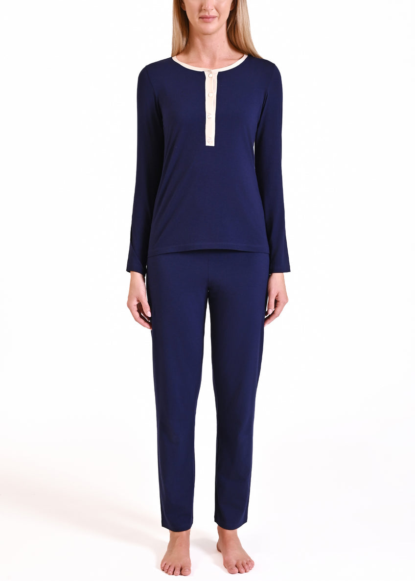 Comfort e stile si incontrano in questo pigiama lungo realizzato in morbido cotone, ideale per accompagnarti in ogni stagione. La maglia a maniche lunghe è impreziosita dallo scollo a serafino con bottoni e profilo a contrasto, un dettaglio che dona luminosità e carattere al capo. I pantaloni dal taglio lineare, con elastico in vita, garantiscono libertà di movimento e vestibilità naturale.