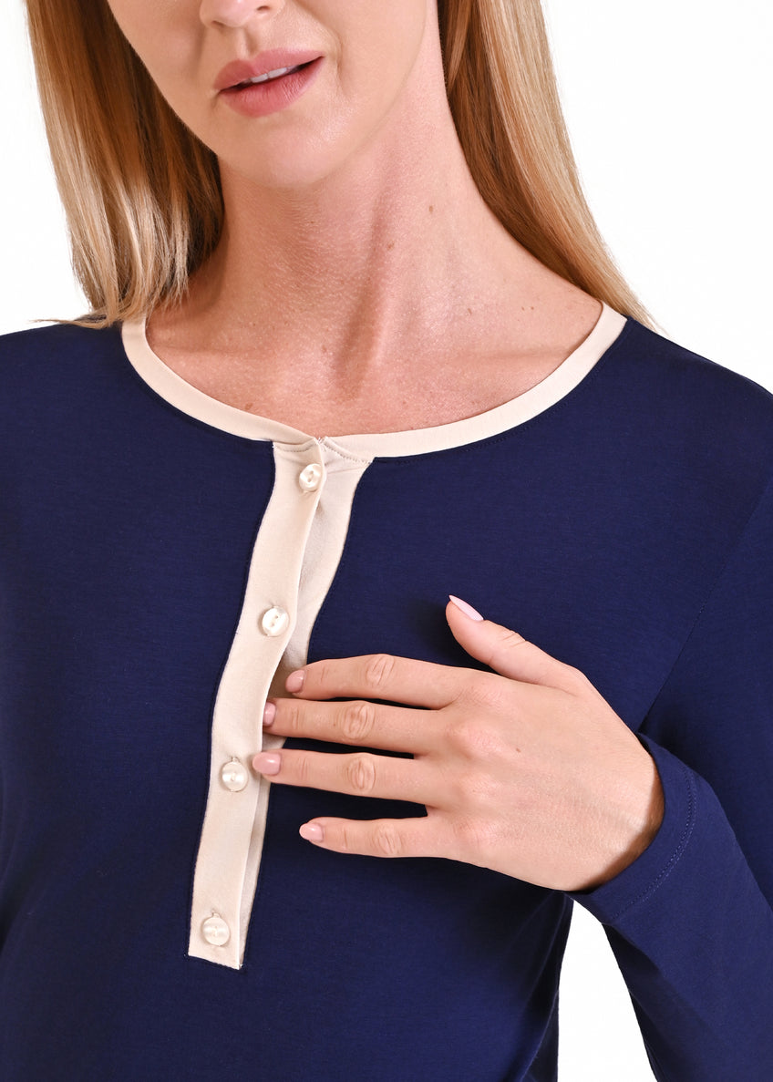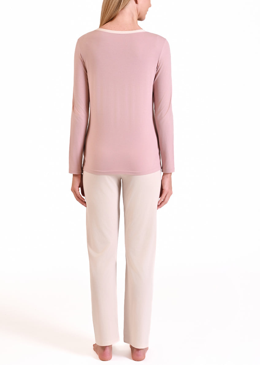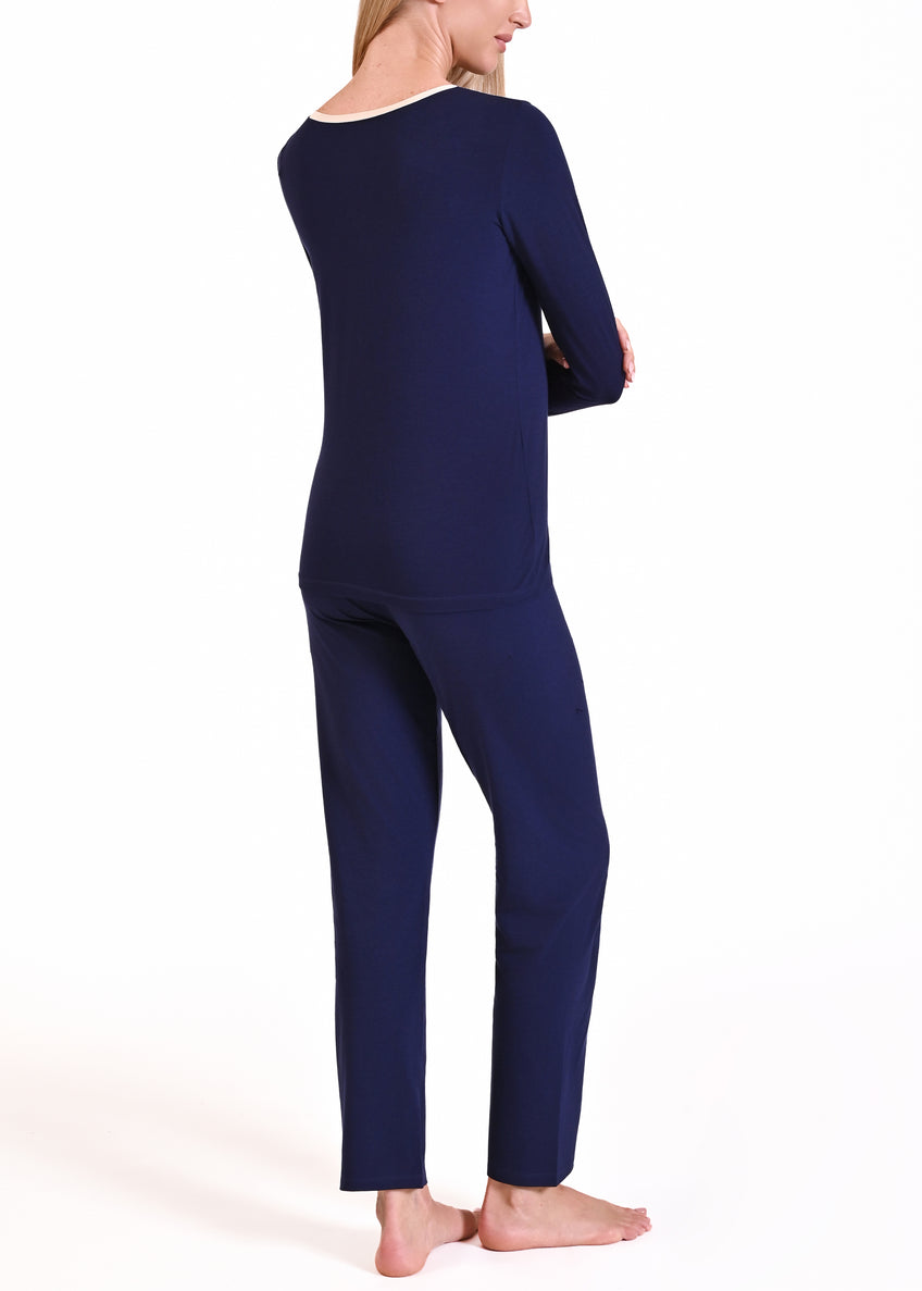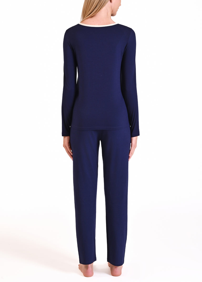Comfort e stile si incontrano in questo pigiama lungo realizzato in morbido cotone, ideale per accompagnarti in ogni stagione. La maglia a maniche lunghe è impreziosita dallo scollo a serafino con bottoni e profilo a contrasto, un dettaglio che dona luminosità e carattere al capo. I pantaloni dal taglio lineare, con elastico in vita, garantiscono libertà di movimento e vestibilità naturale.