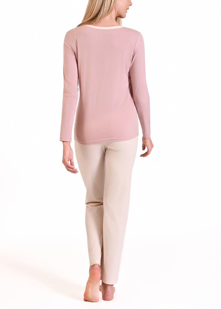 Disponibile in rosa cipria con dettagli panna e in blu scuro con profilo panna, per un look raffinato anche nei momenti di relax.