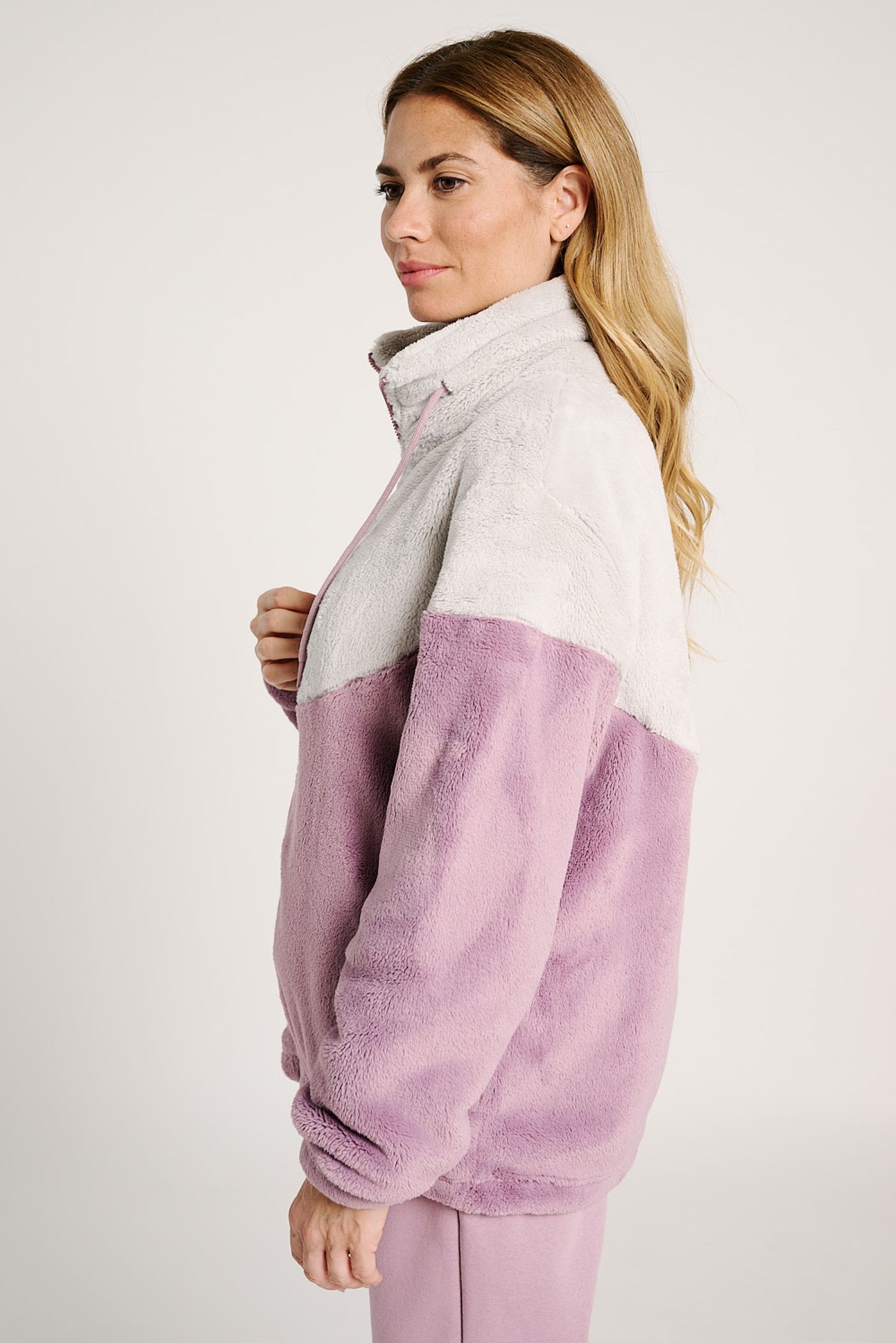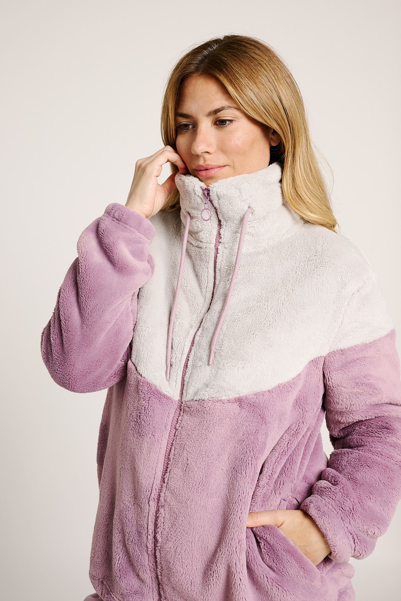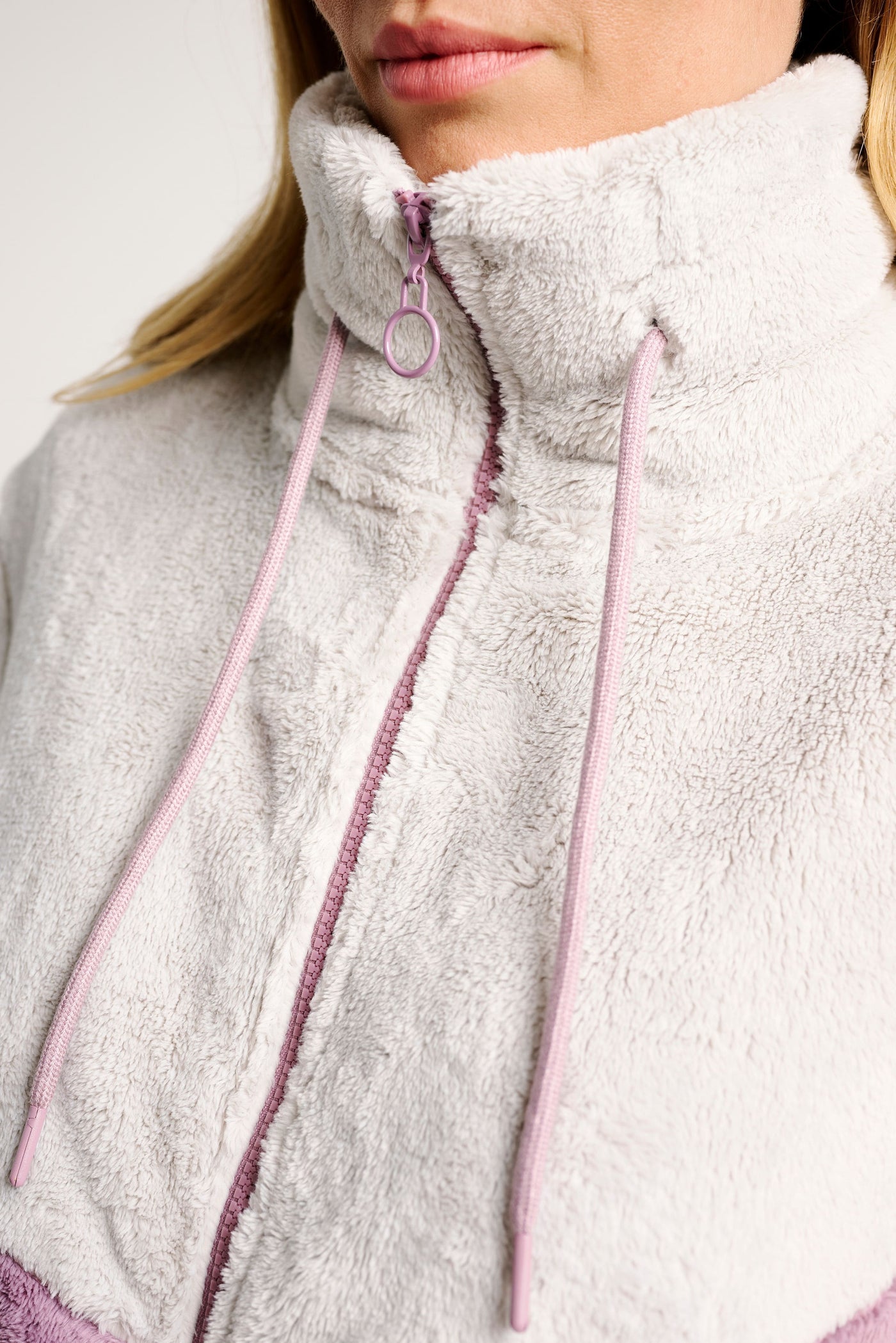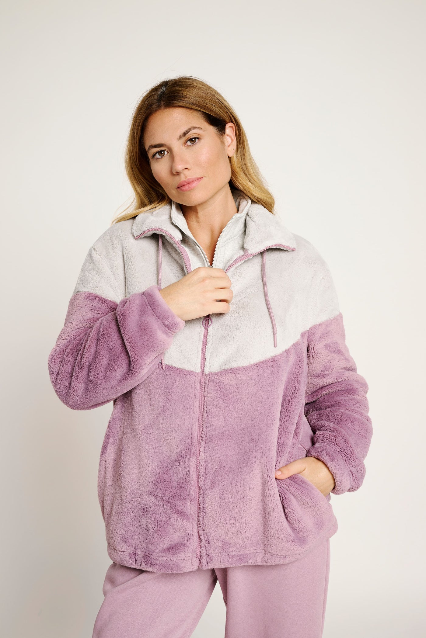 Avvolgente e confortevole, questa giacca è realizzata in morbido pile bicolor nei delicati toni del rosa e grigio chiaro, perfetta per affrontare le giornate più fredde con stile e relax.