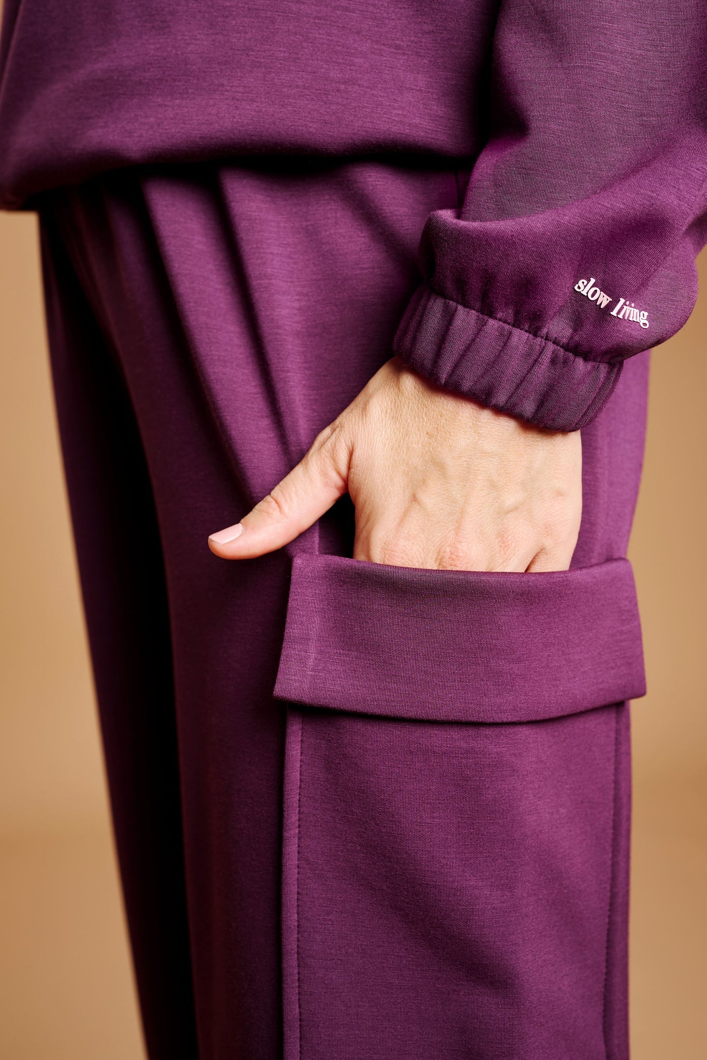 I pantaloni coordinati a gamba dritta completano il look con pratiche tasche cargo laterali, un dettaglio funzionale che aggiunge carattere e versatilità al capo.