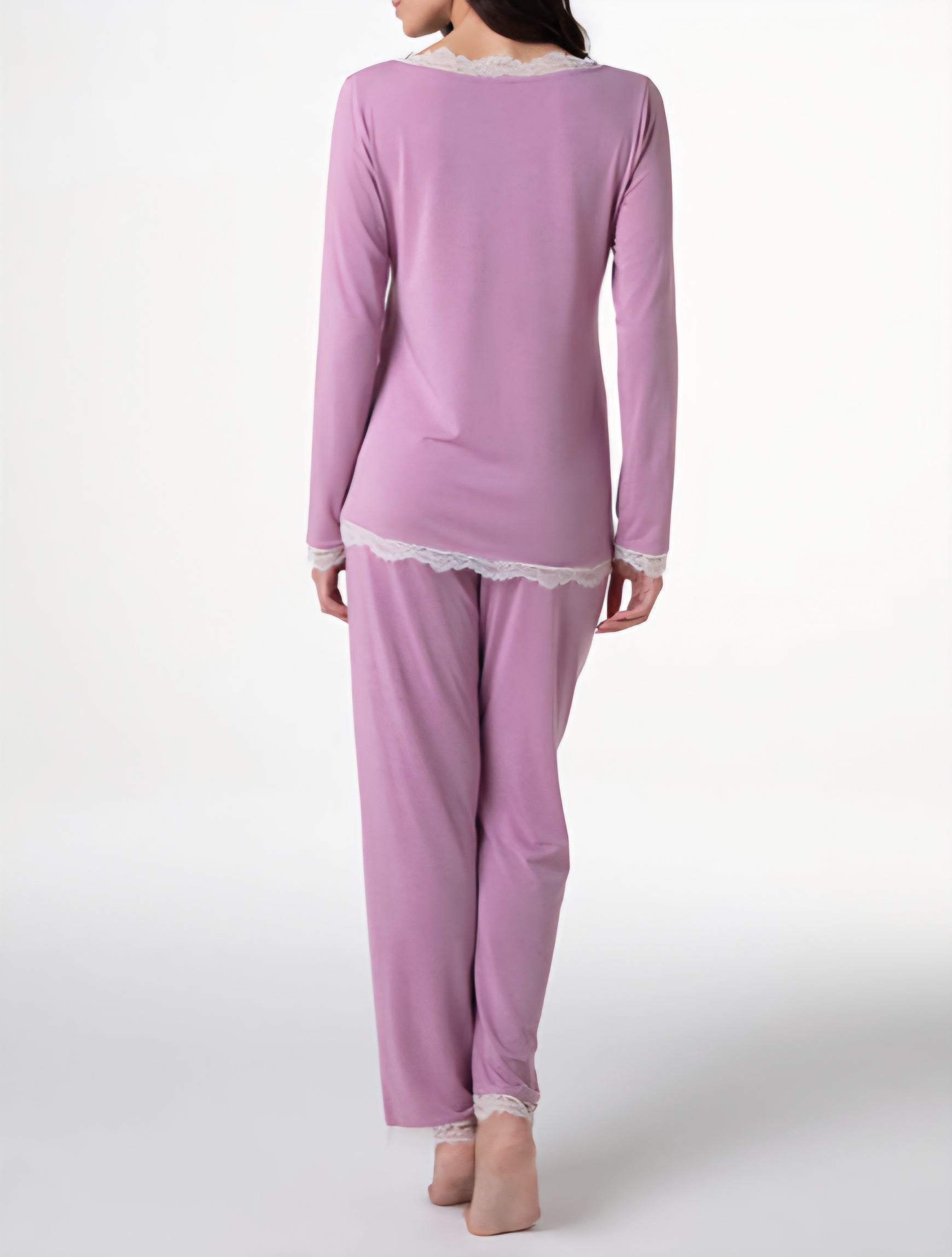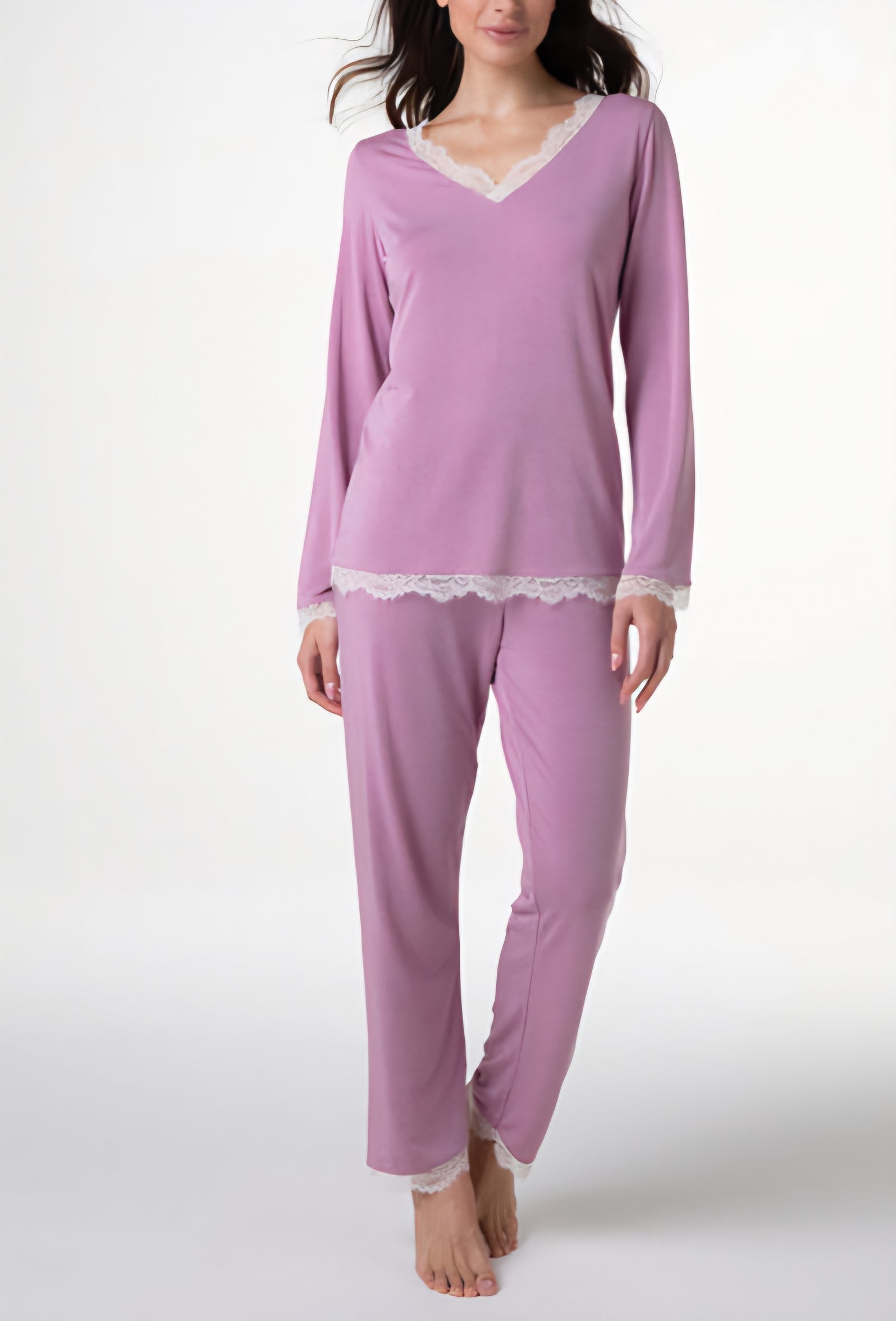 Scopri il pigiama lungo in jersey di modal elasticizzato, nella delicata tonalità rosa orchidea, pensato per chi cerca morbidezza, comfort e un tocco di eleganza durante il riposo. Il modal è un tessuto naturale noto per la sua incredibile morbidezza e leggerezza, che ti accompagna con comfort in ogni stagione.