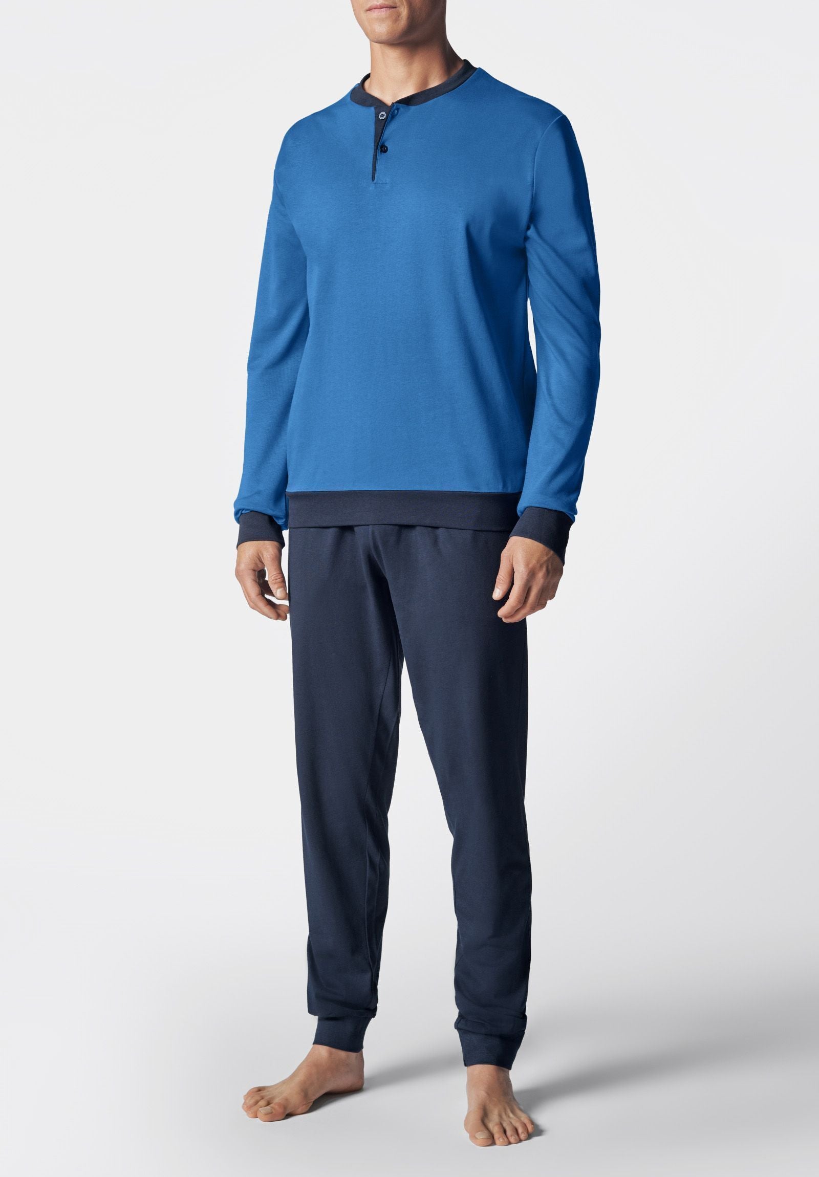 Pigiama lungo da uomo in morbido interlock di cotone misto, ideale per garantire comfort e calore nelle stagioni più fredde.