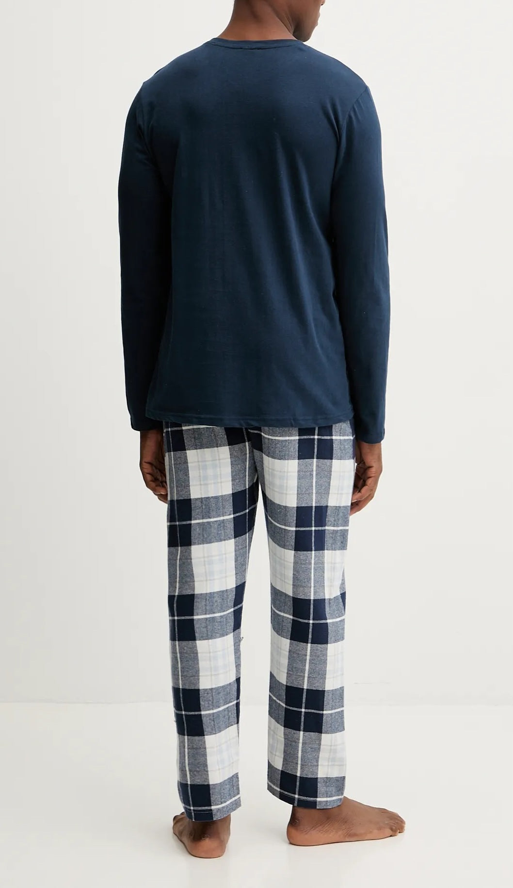 La maglia in morbido jersey di cotone assicura una piacevole sensazione sulla pelle, mentre il pantalone in flanella a quadri aggiunge calore e un tocco classico al look notte.