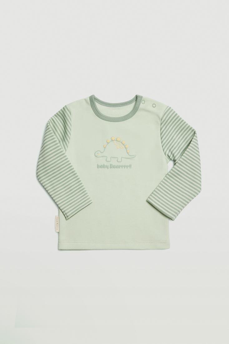 Set da 3 pezzi. La maglietta, a maniche lunghe con chiusura a bottoncini sulla spalla sinistra, presenta un delicato color verde con la stampa di un piccolo dinosauro e scritta "Baby Roarrr", le maniche sono a righe; realizzata in morbido cotone caldo naturale, offre una sensazione di colore e morbidezza che il tuo piccolo adorerà. Il pantalone, sempre in verde, presenta la stampa dal design all over di piccoli dinosauri; per un tocco simpatico e divertente. La bavetta anch'essa presenta la stampa di un simpatico dinosauro, aggiungendo un tocco originale.