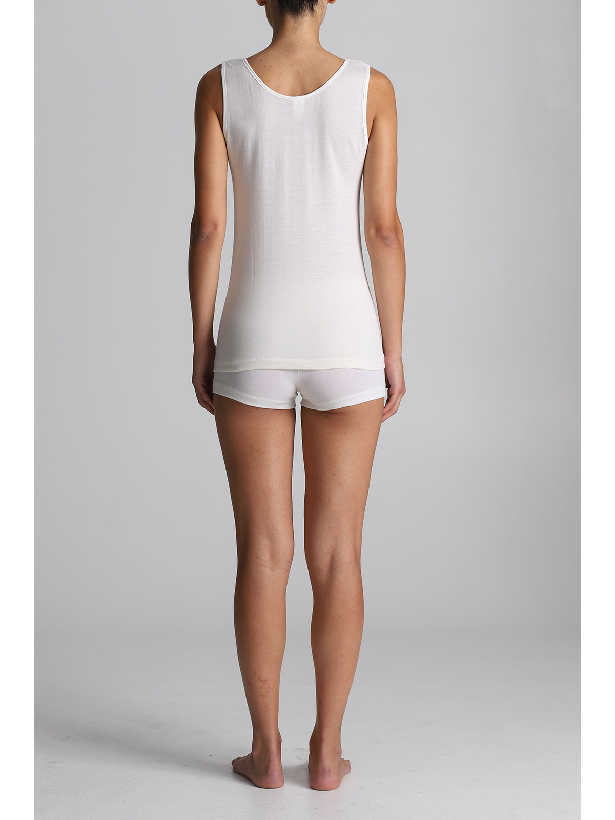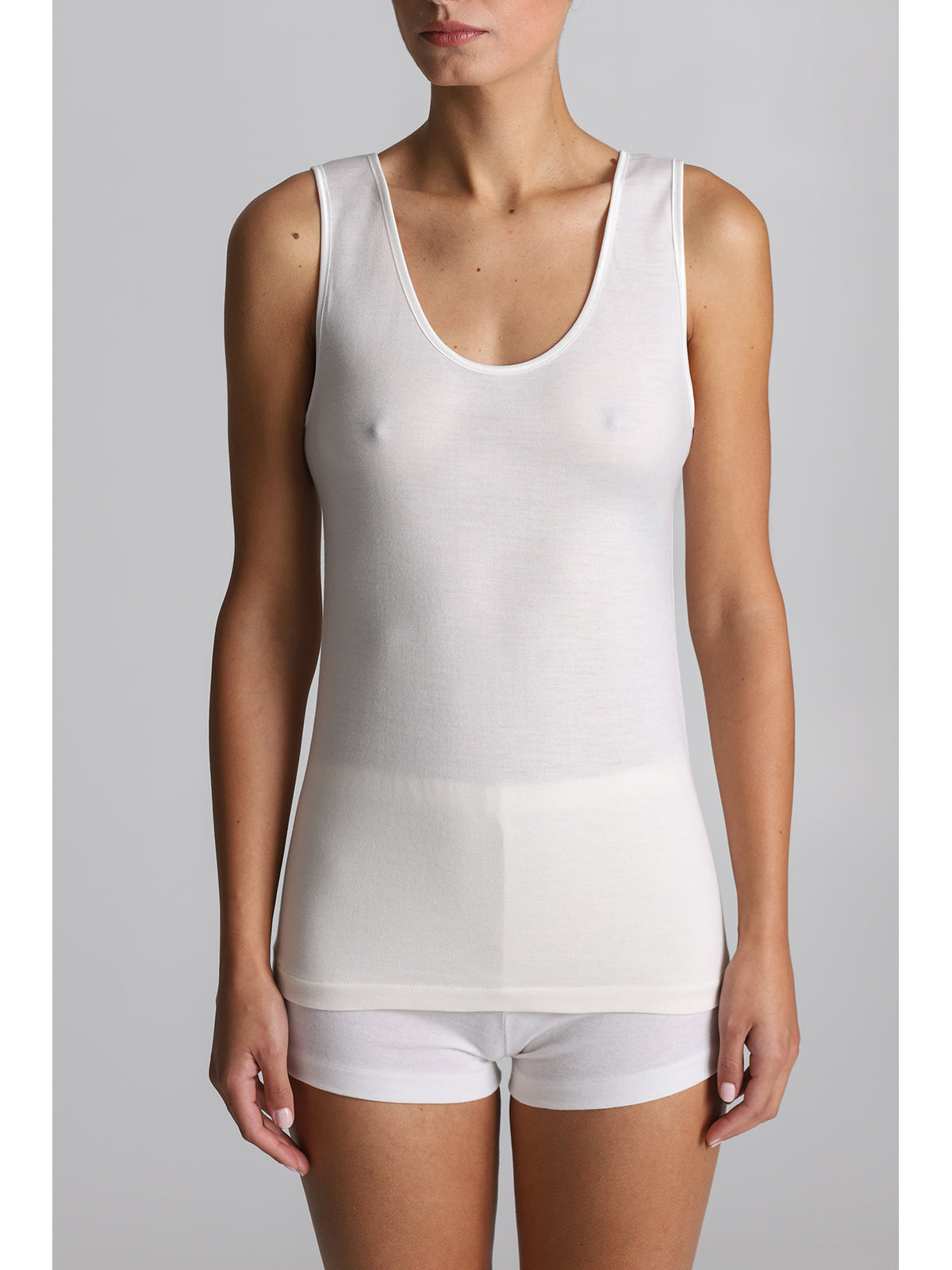 Canotta intima modello spallina larga in costina double: calda lana fuori e morbido cotone sulla pelle. Tutto il pregio di questi due materiali nobili sintetizzati in un unico prodotto, per un comfort unico.