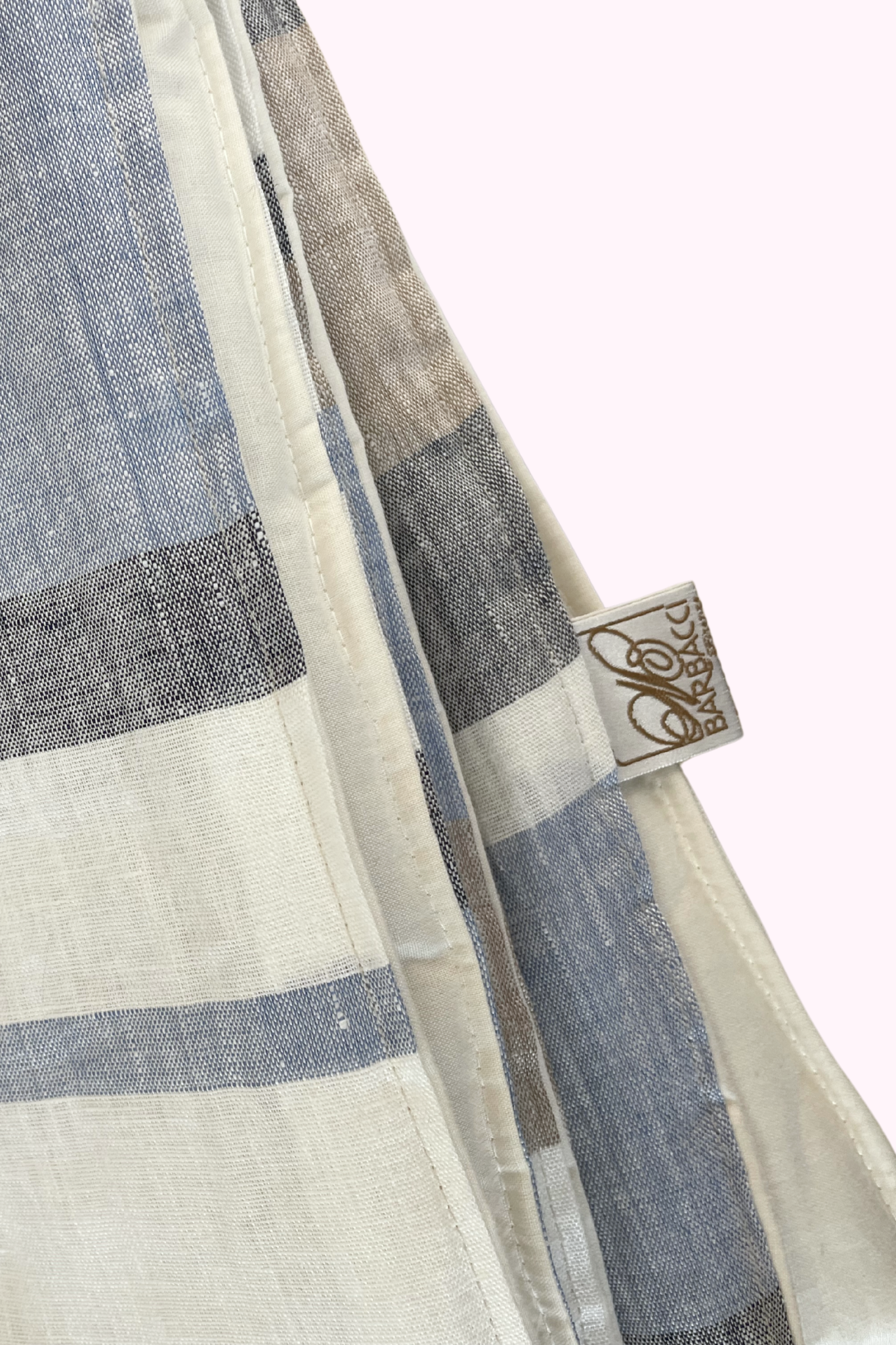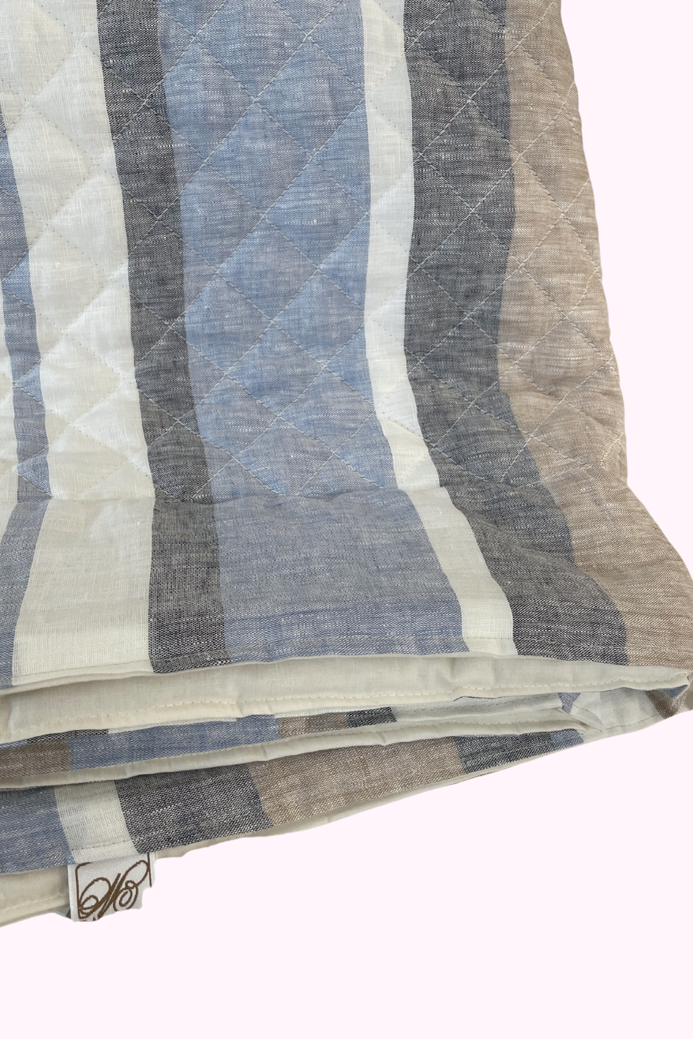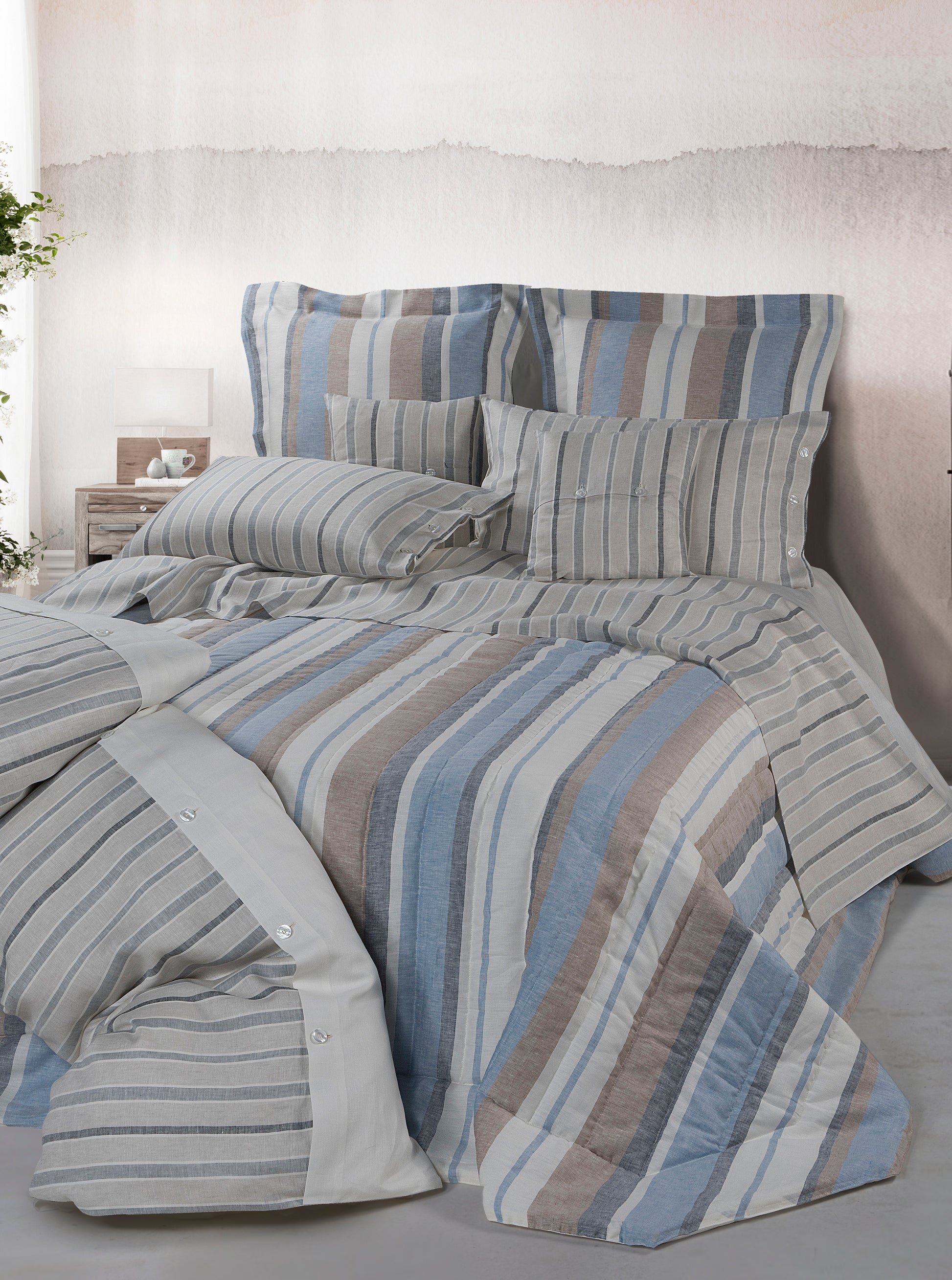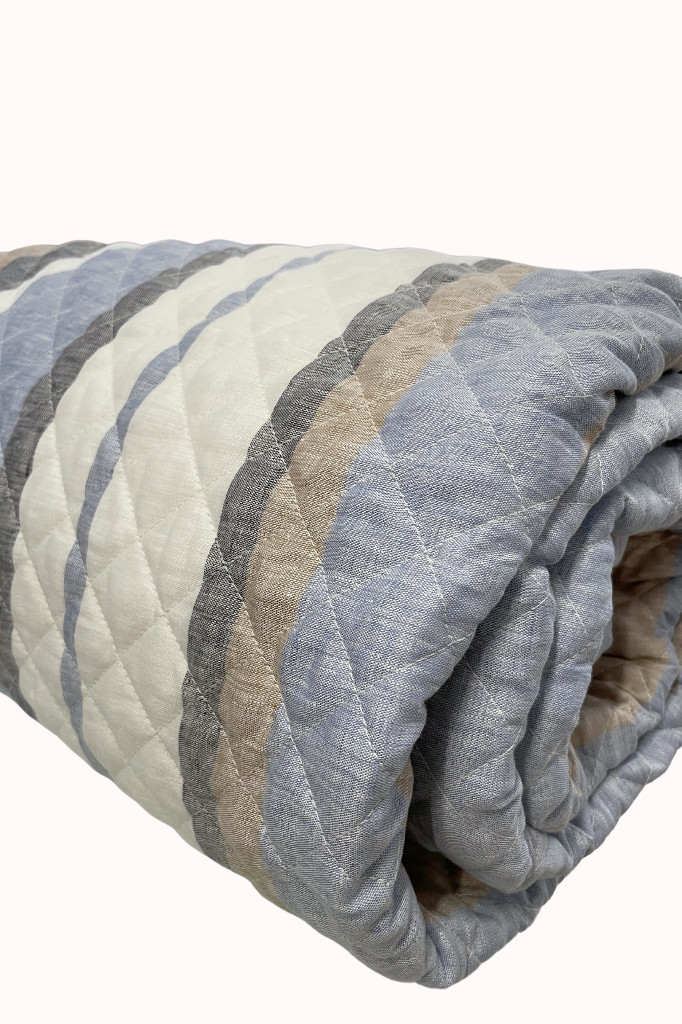 Il motivo a righe verticali multitonali – nei toni polverosi del celeste, sabbia, grigio e avorio – dona alla trapunta un’estetica contemporanea, sobria e senza tempo, perfetta per ambienti eleganti dallo stile naturale o minimalista.