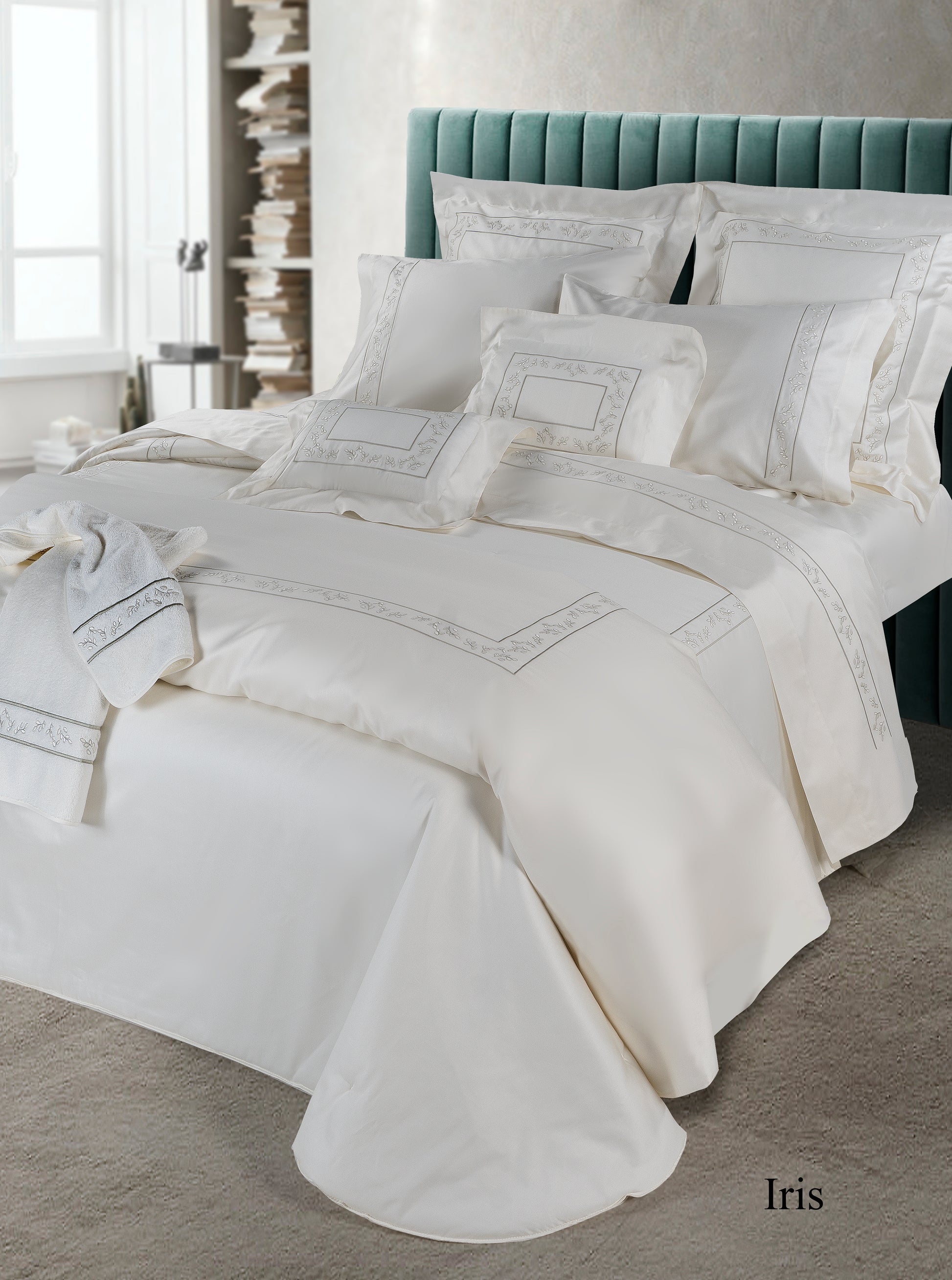 Il tessuto in morbido cotone color panna è impreziosito da un delicato ricamo floreale ton sur ton, ispirato ai motivi naturali, che corre lungo i bordi creando una cornice armoniosa e discreta. Un dettaglio sartoriale che dona carattere senza ostentazione, trasformando il letto in un rifugio di comfort ed eleganza.