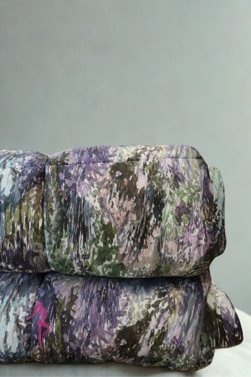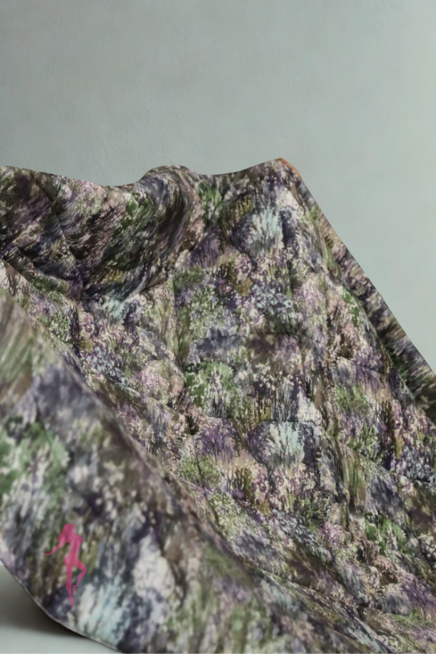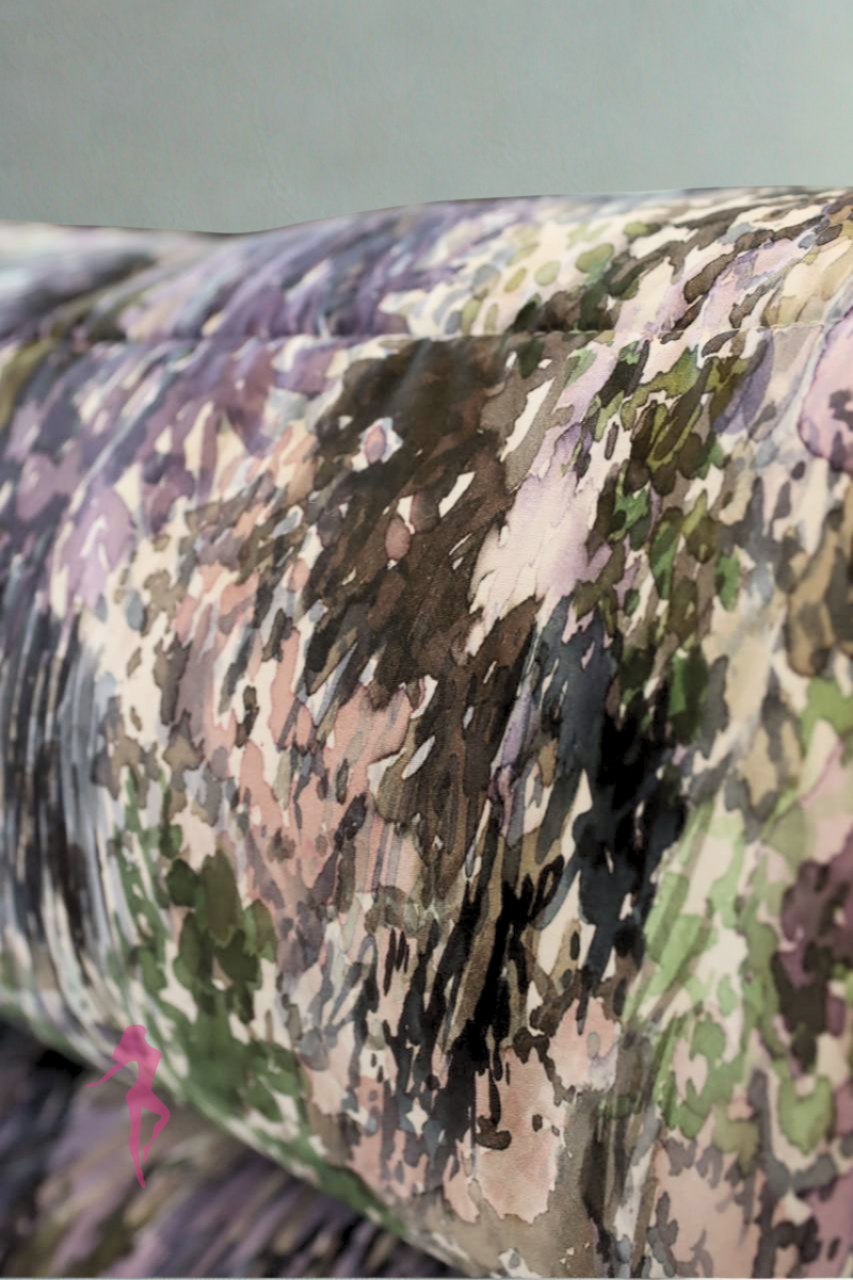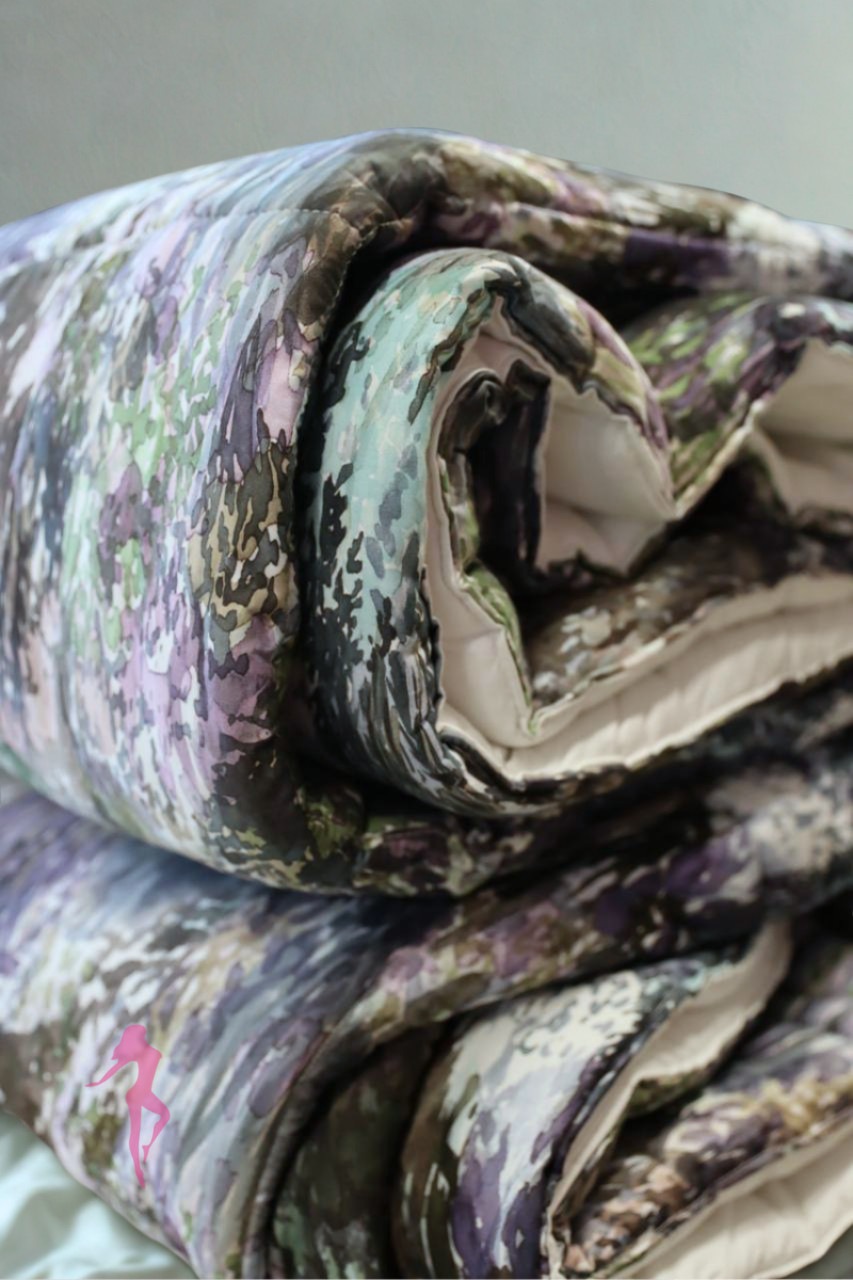 La trapunta Barbacci con effetto marmorizzato conquista per la sua stampa materica e ricercata, che richiama le venature naturali della pietra e i riflessi del marmo nei toni del verde salvia, del viola polveroso e del grigio antracite.