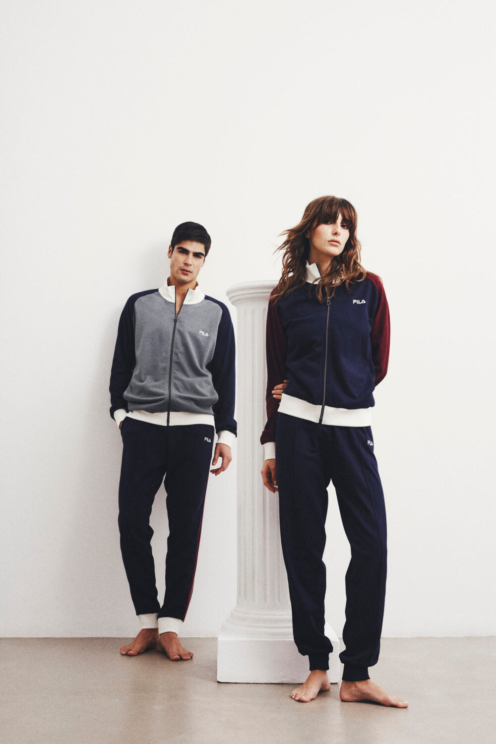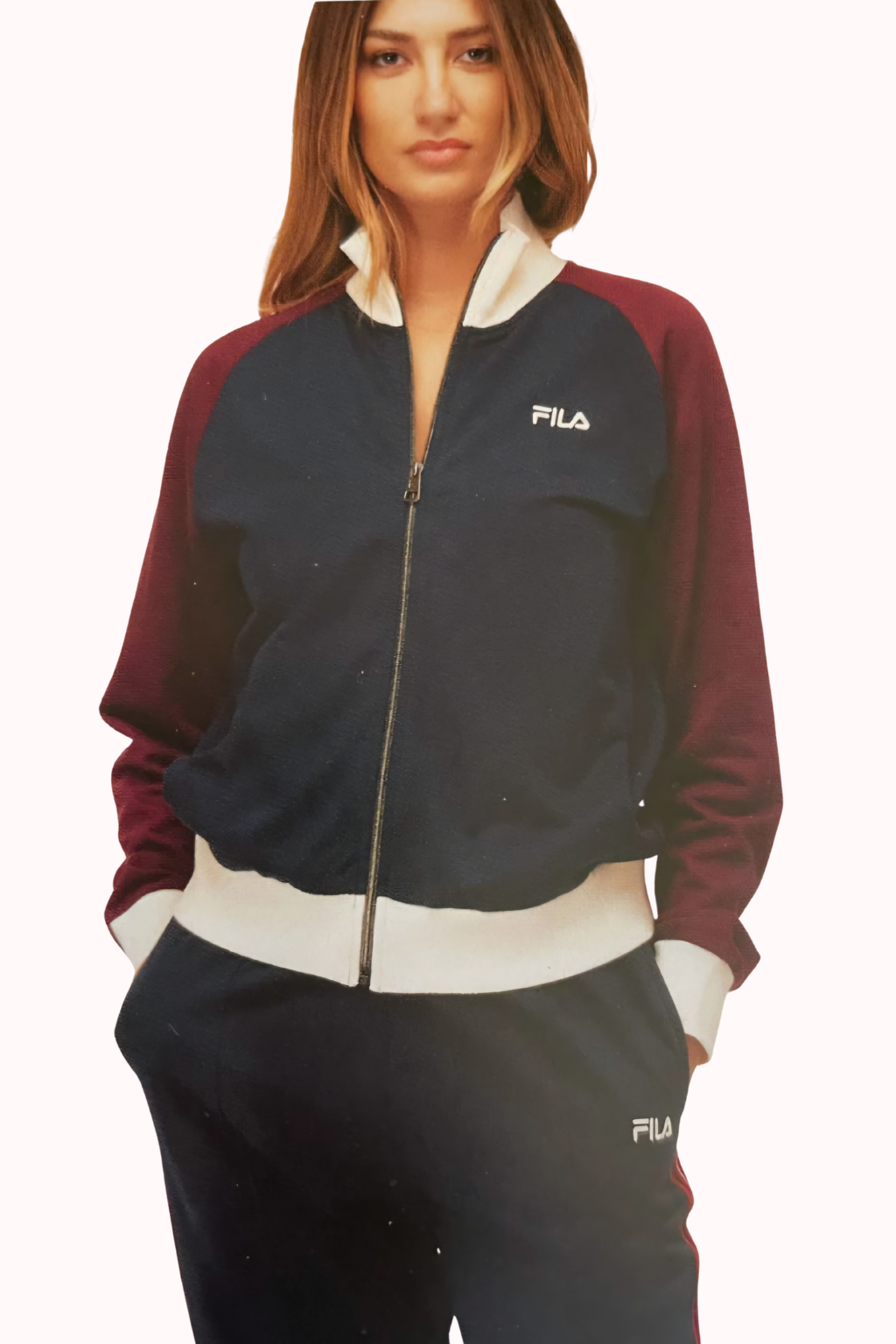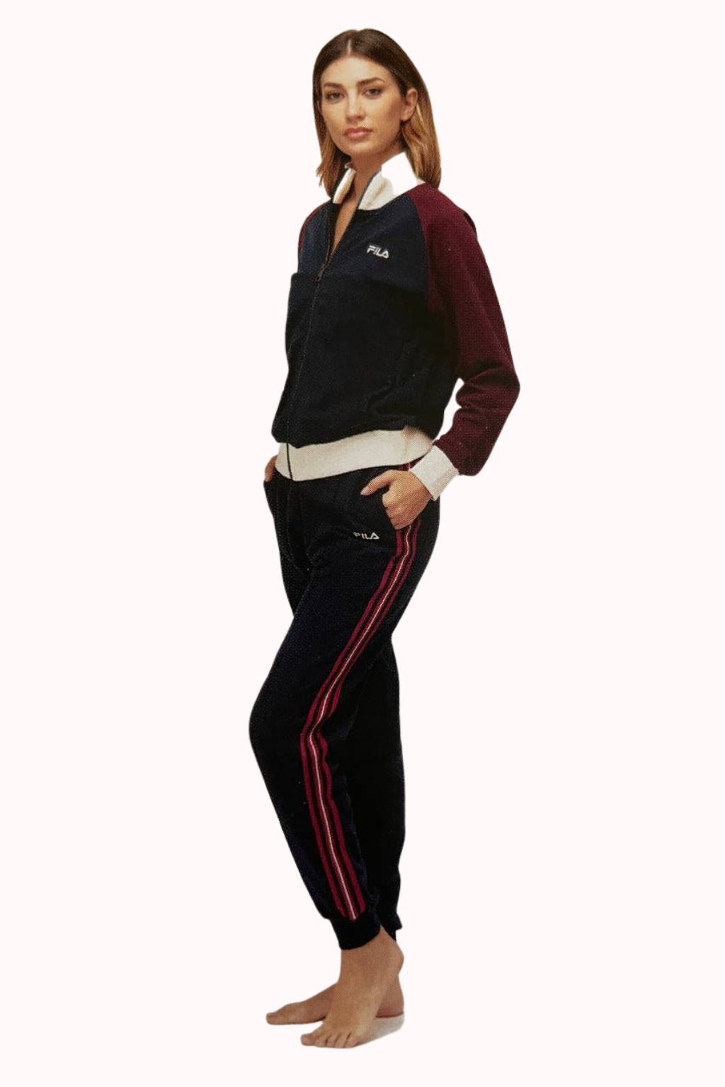 Questa tuta FILA da donna in morbido cotone felpato combina comfort e stile sportivo con un design bicolor nei toni blu navy e bordeaux, rifinito da dettagli panna.